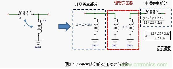 如果在這樣的天線中安裝一定變壓比的變壓器,是不能只整合一個(gè)band的阻抗的。所以,天線用變壓器,必備的設(shè)計(jì)需求是要使變壓比適應(yīng)天線的阻抗頻率特性。這種適應(yīng)方法如圖2所示,是一種將理想的變壓部分和寄生成分部分分解開來的等效電路。
