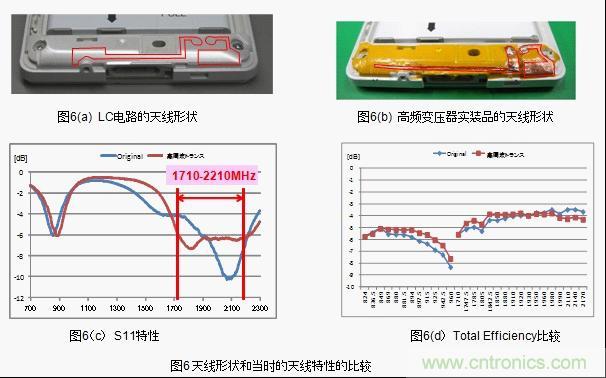 結(jié)果顯示,low band 情況下LC電路和高頻變壓器都不可能達(dá)到「S11<-6dB」(反射損耗1.2dB)。而high band情況下,達(dá)到「S11<-6dB」范圍的,如果使用LC電路的話是300MHz,而使用高頻變壓器的話則是500MHz,達(dá)到了66%的改善效果。(圖6(c)) 。此外,LC電路和高頻變壓器中天線的綜合特性顯示「Total Efficiency」,low band的高頻側(cè)也得到了0.6dB的改善效果。(圖6(d))。這種改善效果正是由于帶寬的廣帶寬化和I.L.得到了改善。