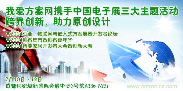 我愛方案網( www.52solution.com)和CNT Networks攜手中國電子展主辦的“2014工業(yè)、物聯(lián)網和嵌入式設計方案展暨中國西部電子開發(fā)者與創(chuàng)客論壇”即將于2014年7月10日-12日在成都開幕。作為2014中國(成都)電子展同期舉辦的核心活動,本屆活動緊扣中國西部電子熱點,針對西部中國的市場需求,努力發(fā)掘西部得原創(chuàng)力量,特別突出了工業(yè)、物聯(lián)網、智慧城市和智能家居等領域選拔出的方案,著力打造物聯(lián)網“落地”應用,為中國西部電子行業(yè)的發(fā)展和升級提供新的支點。同期同地,我愛方案網還將舉辦2014創(chuàng)客集市暨創(chuàng)客嘉年華活動,以及與千家網合辦2014智能家居開發(fā)者論壇暨創(chuàng)新大賽(成都)。