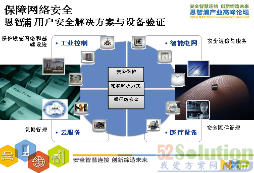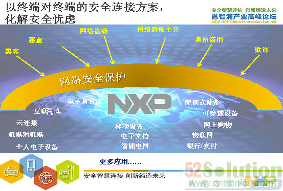 從以上圖中可以看到NXP保障網(wǎng)絡(luò)安全的方案,從工業(yè)控制,智能電網(wǎng),醫(yī)療設(shè)備和云服務(wù)方面。另外,NXP也提供以終端對(duì)終端的安全連接方案在互聯(lián)汽車(chē)、物聯(lián)網(wǎng)和便攜的可穿戴式應(yīng)用。