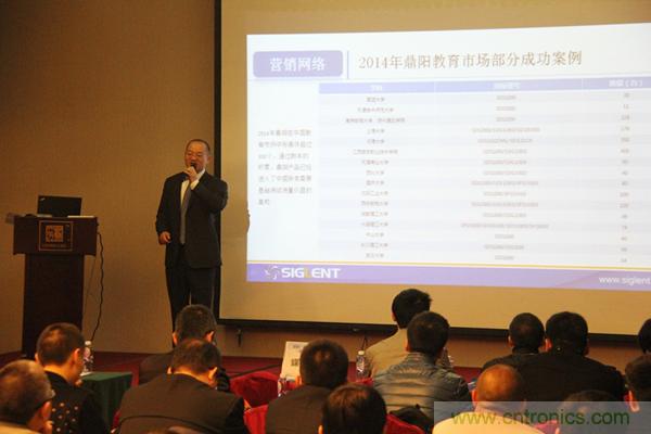 會議伊始,鼎陽科技董事長兼總裁秦軻先生進行了精彩致辭,總結了鼎陽科技在2014年取得的巨大成就,展望了鼎陽科技在2015年的宏偉前景,為鼎陽科技在新一年的持續(xù)高速增長擺下了棋陣。2014年鼎陽科技的銷售額增長了41%;MSO2000、SDS3000、SDM3000在取得了眾多工藝上的突破之后順利量產。去年,鼎陽科技美國分公司在克里夫蘭正式成立,為北美市場的下一輪增長做了堅實的鋪墊。2014年,鼎陽科技參加了海內外的多個大型展會,標志著鼎陽科技正式立足于測試測量儀器領域主流品牌的行列。與此同時,鼎陽科技與廣州工業(yè)大學深度合作,建立了聯合實驗室,第一屆鼎陽杯也圓滿落幕,增強了鼎陽科技在高校用戶群體中的知名度,進一步鞏固了鼎陽科技在教育領域的影響力。