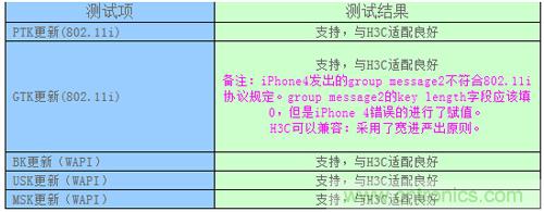 從測試結(jié)果可以看出,iPhone 4的GTK更新報(bào)文并不符合802.11i協(xié)議的規(guī)定,對group message2的key length域錯誤的進(jìn)行了賦值。H3C設(shè)備由于對此采用了寬進(jìn)嚴(yán)出的原則,可以很好的進(jìn)行兼容。這一點(diǎn)也體現(xiàn)出手機(jī)終端兼容性測試的重要性。
