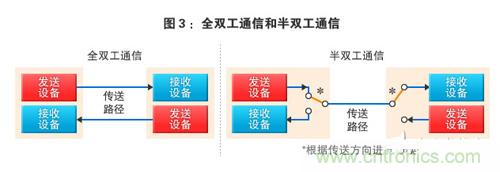 在異步通信中,能實(shí)現(xiàn)按“單片機(jī)→外圍設(shè)備”或“外圍設(shè)備→單片機(jī)”的方向確保數(shù)據(jù)信號(hào)專用的信號(hào)線時(shí),被稱為全雙工通信。另一方面,將通過(guò)1根信號(hào)線來(lái)切換通信方向的方式稱為半雙工通信。全雙工方式時(shí)需要2根信號(hào)線,可同時(shí)進(jìn)行發(fā)送和接收。半雙工方式時(shí)僅需1根信號(hào)線,但必須在發(fā)送和接收之間進(jìn)行切換(圖3)。