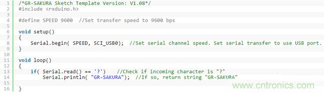 圖4:樣本程序:從Terminal輸入“?”后,將傳送回“GR-SAKURA”的信息。