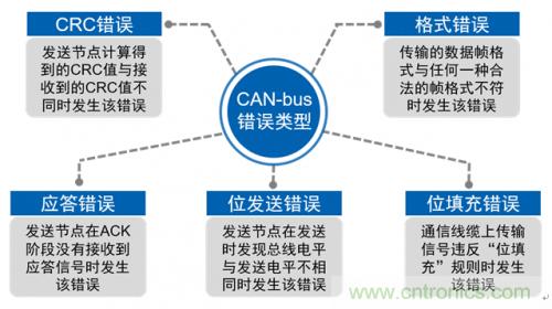 CAN-bus的可靠性很高,但是在某些情況下還是發(fā)生錯誤,為了使數(shù)據(jù)能夠在總線上可靠傳輸,CAN-bus規(guī)范對各類幀的格式、用途及發(fā)送時機都進行了詳細的規(guī)定。下面我們來總結(jié)下在CAN通訊中會出現(xiàn)哪些錯誤。