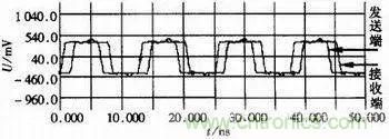 在實際的PCB布線時,如果由于產(chǎn)品結(jié)構(gòu)的需要,不能縮短信號線長度時,應(yīng)采用差分信號傳輸。差分信號有很強的抗共模干擾能力,能大大延長傳輸距離。差分信號有很多種,如ECL、PECL、LVDS等,表1列出LVDS相對于ECL、PECL系統(tǒng)的主要特點。LVDS的恒流源模式低擺幅輸出使得LVDS能高速驅(qū)動,對于點到的連接,傳輸速率可達(dá)800Mbps,同時LVDS低噪聲、低功耗,連接方便,實際中使用較多。LVDS的驅(qū)動器由一個通常為3.5mA的恒流源驅(qū)動對差分信號線組成。接收端有一個高的直流輸入阻抗,幾科全部的驅(qū)動電流流經(jīng)10Ω的終端電阻,在接收器輸入端產(chǎn)生約350mV電壓。當(dāng)驅(qū)動狀態(tài)反轉(zhuǎn)時,流經(jīng)電阻的電流方向改變,此時在接收端產(chǎn)生有效的邏輯狀態(tài)。圖5是利用LVDS芯片DS90LV031、DS90LV032把信號轉(zhuǎn)換成差分信號,進(jìn)行長距離傳輸?shù)牟ㄐ螆D。在仿真時設(shè)置仿真頻率為66MHz理想方波,傳輸距離為508mm,差分對終端接100Ω負(fù)載匹配傳輸線的差分阻抗。從仿真結(jié)果看,LVDS接收端的波形除了有延遲外,波形保持完好。
