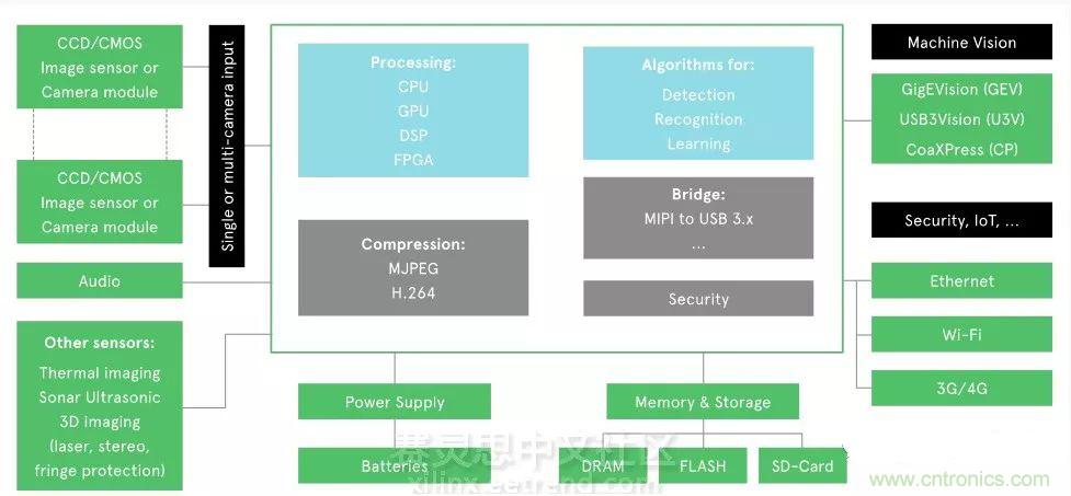 作為系統(tǒng)的輸入CMOS和CCD是目前圖像采集采用的兩種領(lǐng)先技術(shù),CCD能夠提供更高的圖像質(zhì)量,但是經(jīng)過(guò)過(guò)去10年的發(fā)展CMOS與其的差距也越來(lái)越小了,在功耗、成本和功耗方面大有超過(guò)CCD之勢(shì)。此外很多應(yīng)用都需要高效的并行處理系統(tǒng),因此需要采用專(zhuān)用的硬件處理器比如GPU、DSP、FPGA和多核(multi-core)SoC,但是這無(wú)疑會(huì)增加系統(tǒng)的成本、功耗和PCB尺寸等,因此一款經(jīng)濟(jì)高效的處理器也是行業(yè)所需。當(dāng)然在實(shí)際應(yīng)用中我們要根據(jù)系統(tǒng)的實(shí)時(shí)性能、功耗、圖像精度和算法復(fù)雜度來(lái)選擇合適的處理器。