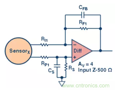 第一級,一個簡單的差分放大器 (圖2)。該放大器的增益為 4×,輸入阻抗為 500 Ω。設(shè)置電容是為了進行可選的濾波處理。