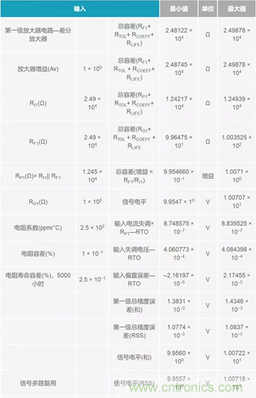 往下,在表格左側(cè),把所有誤差細分到各電阻級。電阻誤差也細分到了各個級,以便于了解相應(yīng)的權(quán)衡情況。右側(cè)所示為在信號流進流出各級時連讀計算和累計計算的誤差。