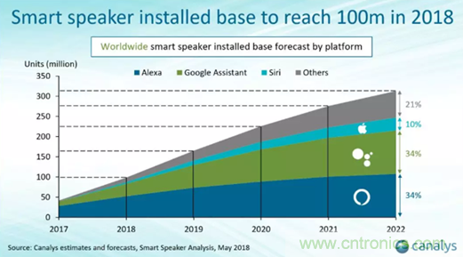 自亞馬遜在2014年底發(fā)布了其第一款智能音箱Echo后,全球、尤其是國(guó)內(nèi)掀起了一股狂熱的智能音箱潮,據(jù)不完全統(tǒng)計(jì),截止到今年三月,中國(guó)大陸有近百家廠商進(jìn)入智能音箱市場(chǎng)。分析機(jī)構(gòu)Canalys最近報(bào)告指出,預(yù)計(jì)今年全球智能音箱的保有量突破一億部,到2020年這個(gè)數(shù)字將會(huì)上升到2.25億智能音箱廠商競(jìng)爭(zhēng),其實(shí)是智能家居生態(tài)入口的競(jìng)爭(zhēng)。