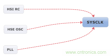 1、 SYSCLK時鐘源有三個來源:HSI RC、HSE OSC、PLL