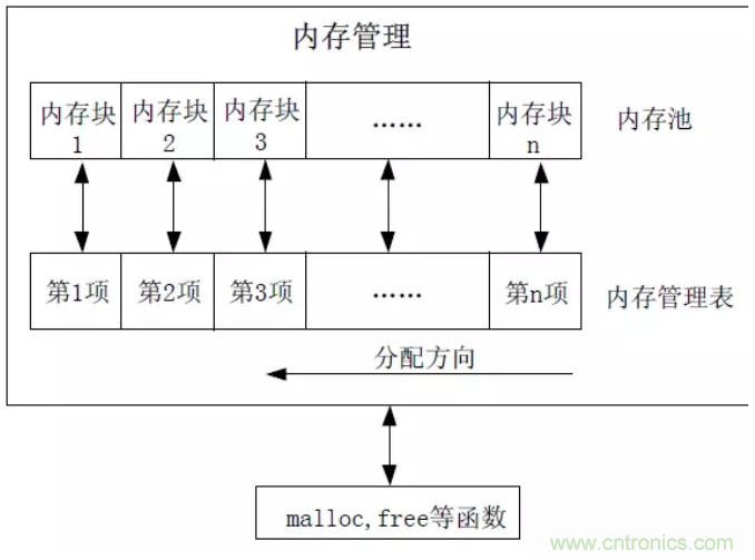 注意表中的分配方向,從頂?shù)降住C恳豁棇粋€內(nèi)存塊。里面的數(shù)值代表了內(nèi)存池的狀態(tài):如果為0,表示該內(nèi)存沒有被分配;如果非0,那么數(shù)值的大小就表示了該塊內(nèi)存被連續(xù)占用的內(nèi)存數(shù)。