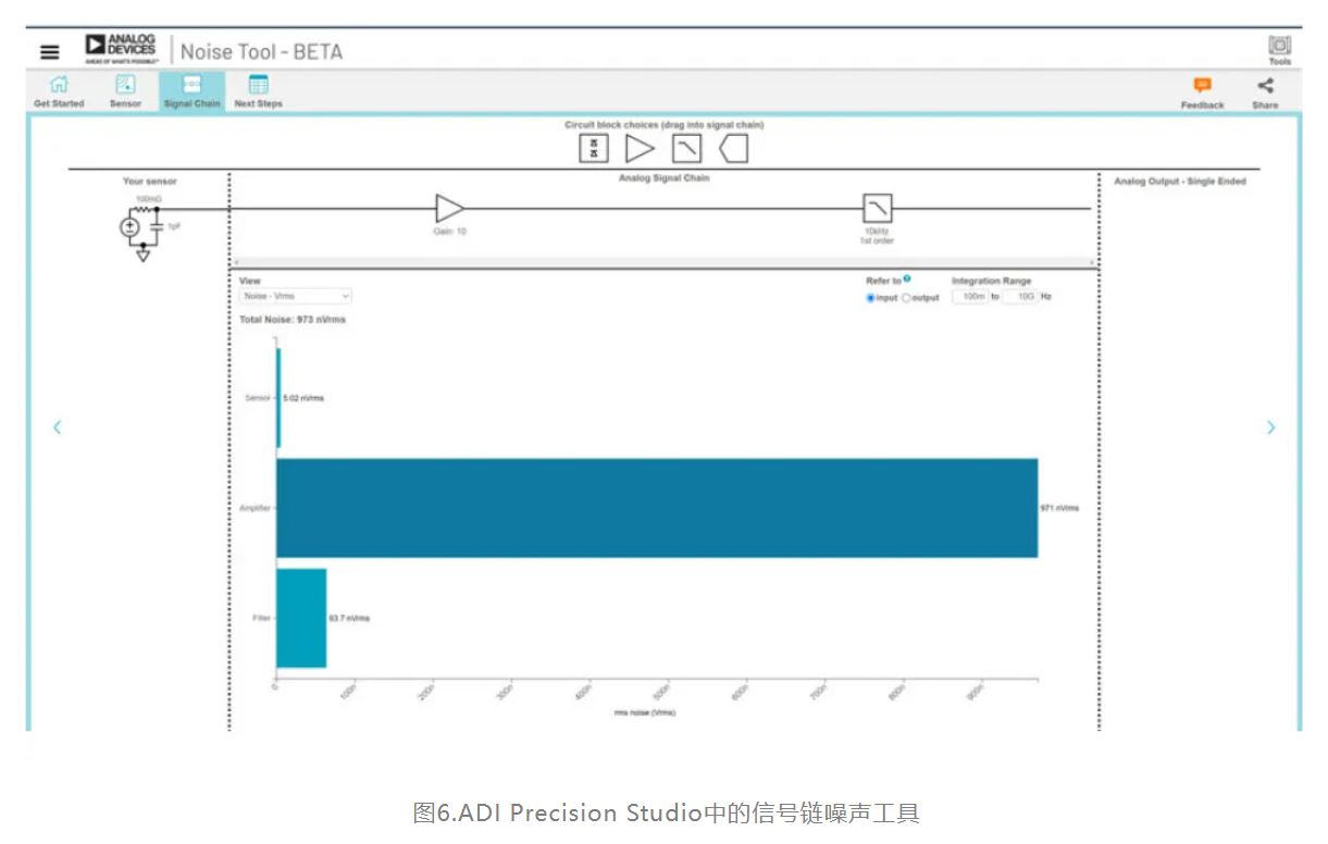 信號鏈噪聲工具 是ADI Precision Studio web工具套件的一部分,用于執(zhí)行信號鏈級的噪聲計(jì)算,包括總噪聲的積分和虛擬RTI噪聲計(jì)算。從傳感器開始構(gòu)建信號鏈,或從示例開始,然后利用信號鏈噪聲工具確定從傳感器到ADC的整個(gè)信號鏈的總噪聲和交流性能。信號鏈噪聲工具中的仿真模型使用數(shù)據(jù)手冊中的完整測量噪聲曲線來提供實(shí)驗(yàn)室精度的結(jié)果。此類工具的主要優(yōu)點(diǎn)之一是能夠加快設(shè)計(jì)過程。該工具可即時(shí)仿真電路變化對整體噪聲性能的影響,從而加快設(shè)計(jì)迭代速度。完成后的信號鏈可導(dǎo)出到LTspice進(jìn)行定制仿真。