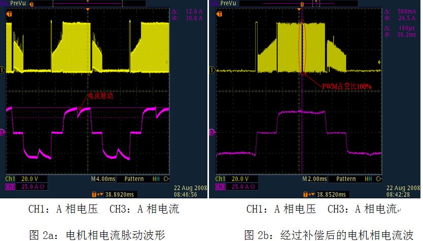 圖2b是采用XC866控制芯片的系統(tǒng)在經(jīng)過上述方法優(yōu)化后測得的換相電流波形,由圖2b可以看出,換相時(shí)的電流脈動(dòng)基本消除,電機(jī)的相電流基本接近方波。用了這套控制系統(tǒng)的電動(dòng)車,起步加速以及運(yùn)行時(shí)的電機(jī)震動(dòng)已基本消除,實(shí)現(xiàn)了超靜音控制器的設(shè)計(jì)。