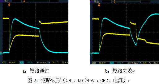 當(dāng)控制器工作時(shí),如電機(jī)短路,則會形成如圖1中所示的流經(jīng)Q2,Q3的短路電流,其電流值很大,達(dá)幾百安培,MOSFET的瞬態(tài)溫升很大,這種情況下應(yīng)及時(shí)保護(hù),否則會使MOSFET結(jié)點(diǎn)溫度過高而使MOSFET損壞。短路時(shí)Q3電壓和電流波形如圖2所示。圖2a中的MOSFET能承受45us的大電流短路,而圖2b中的MOSFET不能承受45us的大電流短路,當(dāng)脈沖45us關(guān)斷后,Vds回升,由于溫度過高,僅經(jīng)過10us的時(shí)間MOSFET便短路,Vds迅速下降,短路電流迅速上升。由圖2我們可以看出短路時(shí)峰值電流達(dá)500A,這是由于短路時(shí)MOSFET直接將電源正負(fù)極短路,回路阻抗是導(dǎo)線,PCB走線及MOSFET的Rds(on)之和,其數(shù)值很小,一般為幾十毫歐至幾百毫歐。