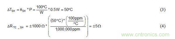 公式3可計算功率耗散所引起的電阻器溫度增加量ΔTSH。公式4將ΔTSH插入公式1替代ΔT,以確定100°C/W適度自發(fā)熱和0.5W功率耗散情況下自發(fā)熱所引起的電阻變化。