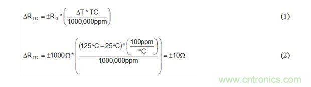 公式1和公式2是溫度從25°C到125°C變化時,如何使用電阻器TC規(guī)范計算1kΩ、±100ppm/°C電阻器阻值ΔRTC變化的實例。