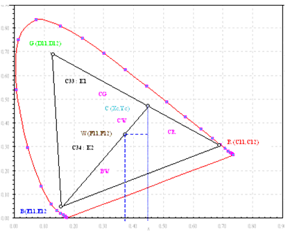 2. 尋找R、G兩種顏色配色后的座標(biāo)(已知R、G、B、W四點座標(biāo)計算BW直線的延長線的交點可得出C點座標(biāo)。