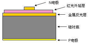 高亮度紅光LED芯片是一種亮度高、可靠性好的發(fā)光器件。相對于普通結(jié)構(gòu)的紅光LED芯片,高亮度紅光芯片采用鍵合工藝實現(xiàn)襯底置換,用到熱性能好的硅襯底(硅的熱導(dǎo)率約為1.5W/K.cm)代替砷化鎵襯底(砷化鎵的熱導(dǎo)率約為0.8W/K.cm),芯片具有更低熱阻值,散熱性能更好,有利于提高可靠性。另外,在P-GaP上鍍反射層,比普通紅光外延層中生長DBR反射鏡出光效率更高。為了克服光在芯片與封裝材料界面處的全反射而降低取光效率,還在芯片制作一些表面紋理結(jié)構(gòu)。相同尺寸相同波長的芯片,20mA電流下,兩者光強相差兩倍以上,圖-1是高亮度紅光芯片剖面示意圖。圖-2是芯片實物圖片.