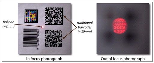 Bokode設(shè)計(jì)從角度來形成及解讀信息,這使得標(biāo)準(zhǔn)相機(jī)看世界的方法和人眼迥異,并可以從遠(yuǎn)距偵識出物體的身份及和光學(xué)標(biāo)簽的相對角度。因?yàn)锽okode它讓使用者可以從很遠(yuǎn)的地方利用現(xiàn)有設(shè)備讀取信息,因此較傳統(tǒng)條形碼更有用,彈性更大。