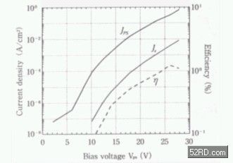 圖6是典型的BSD電子源的電壓?電流特性圖,圖中的橫軸為電壓,縱軸為電流密度,JPS是二極體(diode)的電流密度,JPS表示從二極體表面金屬膜層釋放至真空中的電子emission電流密度,一般emission電流祇能在VPS為正方向時才能觀測到。由圖可知隨著電壓增加,二極體的順向電流與釋放電流亦增大,當(dāng)順向電壓為28V時emission電流密度約為8.9mA/cm²,emission效率約為1.2%左右。