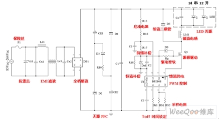 從AC220V看進(jìn)去,交流市電入口接有1A保險(xiǎn)絲F1和抗浪涌/雷擊的壓敏電阻Vz1;之后是EMI濾波器,由Ld1、Lc1和Cx1、Cx2組成;DB1是全橋整流器,內(nèi)部是4個(gè)高壓硅二極管;CE1、CE2、R10、D2~D4組成無(wú)源功率因數(shù)校正電路;BP2808芯片由R15、R16啟動(dòng)電阻降壓經(jīng)R17、C3前饋補(bǔ)償,并由Dz1、C2、R18與BP2808內(nèi)部電路組成專(zhuān)利的恒流補(bǔ)償電路穩(wěn)壓后給BP2808控制電路供電,系統(tǒng)啟動(dòng)后由于控制電路本身靜態(tài)電流小,以及芯片內(nèi)部存在從OUT到VCC的饋流二極管可向BP2808提供工作電源,此時(shí)電阻R15-17上通過(guò)的電流將大大降低,因而總的系統(tǒng)功耗也大大降低,系統(tǒng)效率得到明顯提高。