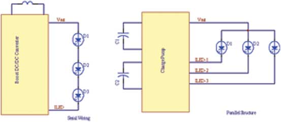 就這點(diǎn)而言,我們可以考慮采用串聯(lián)或并聯(lián)方式對(duì)LED進(jìn)行連接:這兩種連接方式各有其優(yōu)缺點(diǎn),見(jiàn)圖2。
