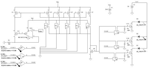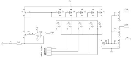 為了在LED中實(shí)現(xiàn)精確及穩(wěn)定的正向偏置條件,通過(guò)與帶隙參考提供的恒定電壓相關(guān)的外部電阻產(chǎn)生一個(gè)參考電流。與運(yùn)算放大器U1相關(guān)的晶體管Q1在Vref引腳產(chǎn)生恒定輸出電壓。Vref和地之間連接的外部電阻產(chǎn)生流經(jīng)Q1和Q2的恒定電流。這個(gè)電流這時(shí)候就被Q3~Q7的晶體管系列建立鏡像和放大,每個(gè)電流被連接至開(kāi)關(guān)S1~S5,并且被晶體管Q8相加。最后,晶體管Q9復(fù)制參考電流至LED1。這種結(jié)構(gòu)針對(duì)每個(gè)LED進(jìn)行復(fù)制,而芯片的布局經(jīng)仔細(xì)分析,以優(yōu)化每個(gè)LED之間的匹配。