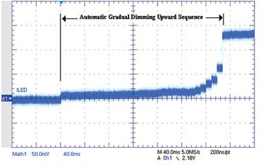圖7典型的NCP5623自動(dòng)向上漸進(jìn)調(diào)光過(guò)程(每級(jí)8ms)