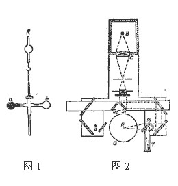 列別捷夫所用儀器的主要部分是一用細(xì)線懸掛起來的極輕的懸體R,其上固定有小翼a及b,如圖1示,其中一個涂黑,另一個是光亮的。將懸體R置于如圖2所示的真空容器G內(nèi)。借助透鏡及平面鏡系統(tǒng)將由弧光燈B發(fā)出的光線射向小翼中的一個。由于作用在小翼上的光壓力,使懸體R轉(zhuǎn)動。轉(zhuǎn)動的大小,可借助望遠(yuǎn)鏡及固定在軸線上的小鏡觀察到。移動雙鏡能使光射在涂黑的小翼上。比較兩種情況下懸體轉(zhuǎn)動的大小,列別捷夫測得,涂黑表面所受的光壓力比反射表面所受的光壓力小一半,與理論完全符合。
