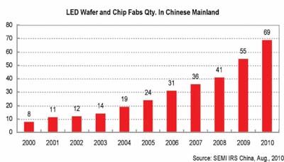 在中國LED產(chǎn)業(yè)結(jié)構(gòu)不斷調(diào)整和優(yōu)化的過程中,未來幾年,中國外延、芯片企業(yè)規(guī)模也將進(jìn)一步擴(kuò)大。到2010年8月,中國已有LED外延和芯片企業(yè)69家(包括20余家在建或計劃中)。在已經(jīng)生產(chǎn)或在建的企業(yè)中,有48家涉及LED核心環(huán)節(jié)外延及芯片制造,有10余家專注于LED芯片制造。