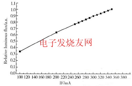 從圖2中可以看出,隨著器件的驅(qū)動電流增加,功率型白光LED的色溫從100mA電流時的5636K增加到350mA電流時的5734K。這是因為,電流加大后,芯片發(fā)出的藍光增多,熒光粉層的厚度是一定的,則在出射的白光中藍光成份增加,從而使器件的色溫增加。
