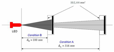 圖4中,點(diǎn)光源光強(qiáng)在空間各方向均勻分布,在不同距離處用不同接收孔徑的探測(cè)器接收得到的測(cè)試結(jié)果不會(huì)改變。但是,LED由于其光強(qiáng)分布不一致,使得測(cè)試結(jié)果隨測(cè)試距離和探測(cè)器孔徑而變化。因此,CIE-127提出了兩種推薦測(cè)試條件,使得各個(gè)LED在同一條件下進(jìn)行光強(qiáng)測(cè)試與評(píng)價(jià)如圖5所示。目前,CIE-127推薦測(cè)試條件已經(jīng)被各LED制造商和檢測(cè)機(jī)構(gòu)引用。