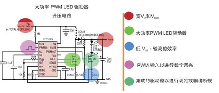 在高電流情況下驅(qū)動LED要求有一個DC/DC控制器,以精確地調(diào)整電流,確保一致的光密度和顏色的統(tǒng)一性,并保護(hù)LED。此外,一個巨大的挑戰(zhàn)是利用電池電壓為一或幾串LED供電,電池電壓可以小于、等于或大于其負(fù)載電壓。另一個考慮是要有效地對大調(diào)光比率的LED進(jìn)行調(diào)光,同時維持其在低和高亮度水平上的色彩特性。此外,DC/DC驅(qū)動器的有效運(yùn)行是一個關(guān)鍵因素,特別是在驅(qū)動高亮度LED時,因為所有沒有用來照明的功率將成為熱損耗。