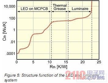 在圖5中,最初的曲線非常陡峭,同時熱容被加熱。這個曲線進行了注解,描述了LED/MCPCB,封固劑(導(dǎo)熱硅脂)和照明設(shè)備三個階段。但在第一個階段內(nèi),曲線描述了更小的一些階段,譬如Dieattach,散熱板,甚至是緊固銅散熱板和MCPCB的膠水。注意這個圖形證實了早期的一個論點,那就是LED自身的熱阻占整個系統(tǒng)結(jié)點至環(huán)境熱阻的50%。