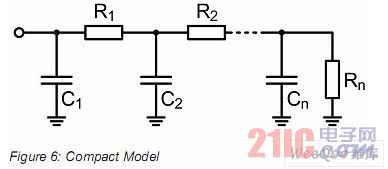 結(jié)構(gòu)函數(shù)可以進一步轉(zhuǎn)變成簡化模型,也就是一個包含熱阻熱容的等效網(wǎng)絡(luò),它包含了結(jié)構(gòu)函數(shù)圖形中所包含的所有數(shù)值。圖6描述了類似功率LED等半導(dǎo)體元件的一個通用模型。當(dāng)然,實際的模型中R和C會有具體的數(shù)值。