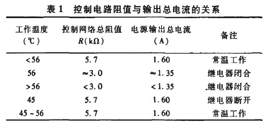 處于斷開(kāi)狀態(tài),此時(shí)控制電路中只有W1起控制作用,設(shè)定常溫工作總電流恒定為1.60A。當(dāng)繼電器溫度上升到56℃時(shí),Kt自動(dòng)閉合,整個(gè)控制電路開(kāi)始工作,以減小恒流電源的輸出;當(dāng)溫度降低到45℃時(shí),Kt自動(dòng)斷開(kāi),電源額定輸出。該過(guò)程可用圖4表示,圖中T為Kt的溫度,Rntc為NTC的阻值。
