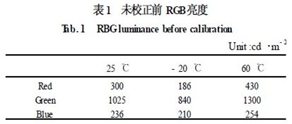 表1 中,常溫的白場配色比例為1. 92 ∶6. 57 ∶1. 51。而當溫度發(fā)生變化時,由于LED 的特性,使RGB 的亮度特性發(fā)生了嚴重的偏移,使白場的比例已完全偏離了常溫下的比例,使圖像在色彩發(fā)生了畸變。而采用本文的校正技術后,結果如表2 所示。
