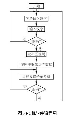設(shè)終端顯示屏所顯示的是16×16的漢字點(diǎn)陣。所以,要想在終端上顯示廣告信息,必須將該信息所包含的漢字的點(diǎn)陣數(shù)據(jù)傳到終端上。在TURBOC3.0中,將漢字賦值給一個(gè)變量時(shí),實(shí)際上是將該漢字的區(qū)位碼賦值給這個(gè)變量。每個(gè)漢字都是16×16的點(diǎn)陣,筆劃經(jīng)過(guò)的地方為“1”,其余為“0”。這樣,按從上到下,從左到右的順序,一個(gè)漢字由256個(gè)點(diǎn)組成,也就是32 個(gè)字節(jié)。漢字按區(qū)位碼的順序排列在漢字字庫(kù)中,區(qū)碼為行,位碼為列,一區(qū)有94位。這樣,某漢字在漢字庫(kù)中的偏移地址為(區(qū)碼×94+位碼)×32.取出后的32字節(jié)漢字點(diǎn)陣,經(jīng)由PC機(jī)的串行口送入到發(fā)射機(jī)中。其流程如圖5所示。