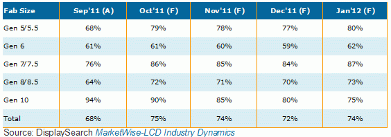 表一、Sep’11-Jan’12全球TFT-LCD面板各世代線產(chǎn)能利用率