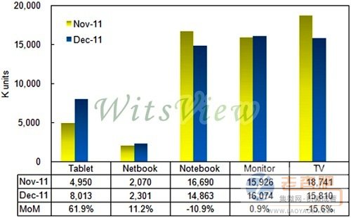根據(jù)WitsView的最新 2011年12月份大尺寸面板出貨調(diào)查報(bào)告顯示,12月份大尺寸面板出貨,較11月份減少2.3%,出貨總量為5,706萬片,較2010年同期衰退8.7%。隨著下游廠商旺季備貨告一段落,整體市場對各應(yīng)用別面板需求開始趨緩,12月初,液晶電視面板出貨在中國市場,尚有小部分的農(nóng)歷春節(jié)備貨需求支撐,但整體電視面板出貨總量僅來到1,581萬片,月減15.6%。
