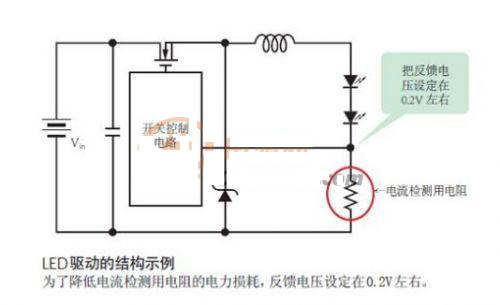 通常,開關(guān)穩(wěn)壓器IC設(shè)定的反饋電壓約為1.2V。但對于LED驅(qū)動IC,1.2V過大。因?yàn)榘演敵鲭娏鬓D(zhuǎn)換成電壓的數(shù)百mΩ 的電阻(電流檢測用電阻)需要與LED串聯(lián)。對于照明器具等使用的高亮度LED,流經(jīng)的是1.5A和2A等大電流。如果500mΩ的電流檢測用電阻中通過1.5A的電流,僅此一項(xiàng)就會產(chǎn)生0.75W的電力損耗。因此,LED驅(qū)動IC把反饋電壓設(shè)定在了非常低的0.2V左右。這樣一來,不僅可以使用較小的電流檢測用電阻,而且在大電流通過時,也可以把電力損耗控制在較低的水平。