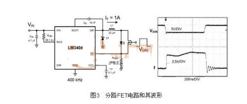 從一個(gè)沒有輸出電容器的快速降壓穩(wěn)壓器著手,出現(xiàn)在輸出電流開啟和關(guān)閉的延遲,是來自集成電路本身的傳導(dǎo)延遲和輸出電感器的物理特性。若要達(dá)到真正高速的PWM調(diào)光,兩個(gè)延遲都須被略過(By Pass)。要實(shí)現(xiàn)這個(gè)目標(biāo),最佳方法就是采用一個(gè)與LED并聯(lián)的電源開關(guān)(圖3)。當(dāng)LED關(guān)閉時(shí),驅(qū)動(dòng)電流便會(huì)分流通過開關(guān),作用就如同一個(gè)典型的N型金屬氧化半導(dǎo)體場(chǎng)效晶體管(N-MOSFET),這時(shí)集成電路會(huì)繼續(xù)運(yùn)行,而電感器電流也會(huì)持續(xù)流動(dòng)。該方法的最大缺點(diǎn)在于LED關(guān)閉時(shí),即使期間的輸出電壓下降到與電流感測(cè)電壓相同,仍會(huì)浪費(fèi)功率。