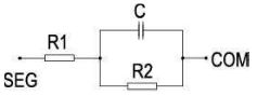 液晶顯示屏是由具有透明電極的ITO玻璃和液晶、偏振片等材料組成的。從電路的角度來講,LCD上ITO走線電阻的大小對(duì)顯示對(duì)比度有很大的影響。LCD的一個(gè)近似等效電路如圖4所示。其中R1表示從LCD電極到LCD像素點(diǎn)的ITO電阻;R2表示LCD像素點(diǎn)的等效直流電阻;C表示該像素點(diǎn)的等效電容。