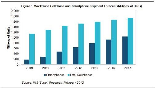 IHS公司的資深首席分析師Steve Mather 認為,2015年全球手機銷量將達17億部,其中10億部將是智能手機。這意味著2015年超過70億的人口中,14%將購買智能手機,如圖3所示。這個規(guī)模十分驚人,全球科技供應(yīng)鏈紛紛調(diào)整方向,脫離電腦產(chǎn)業(yè),投身于智能手機市場。時間框架:三年。