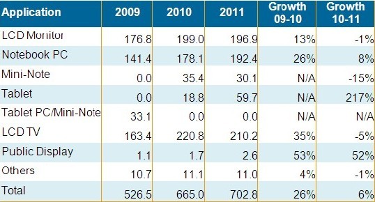 筆記本電腦與公共顯示器依舊維持較佳表現(xiàn),分別有8%與52%的出貨成長(zhǎng)。平板電腦尤其是蘋(píng)果iPad的強(qiáng)勁出貨態(tài)勢(shì),使平板電腦面板在2011年出貨接近6千萬(wàn)片,較2010年大幅成長(zhǎng)21%。