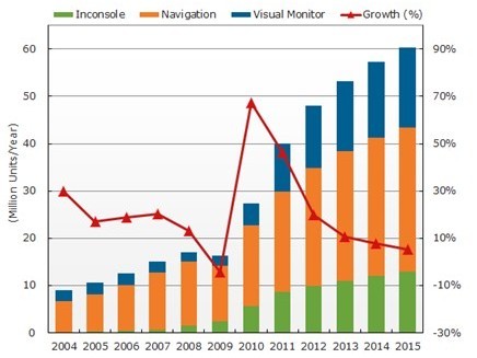 平板顯示器于車載的應(yīng)用已經(jīng)越來(lái)越盛行,如汽車導(dǎo)航、多功能駕駛儀表盤、以及后座娛樂(lè)顯示屏幕等。NPD DisplaySearch預(yù)測(cè)應(yīng)用于車載的面板出貨量將有望從2011年的4千2百萬(wàn)片成長(zhǎng)到2015年的6千2百萬(wàn)片。