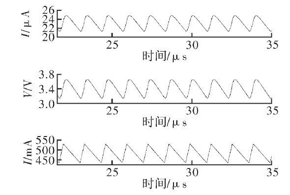 為驗(yàn)證文中提出的電流采樣電路的功能,結(jié)合滯環(huán)控制電路及外部負(fù)載在Cadence中進(jìn)行了仿真。圖5為輸入電壓20 V時(shí)采樣電流、電壓與負(fù)載電流的關(guān)系。由圖可見,采樣電流與采樣電壓隨負(fù)載電流同相周期性變化,周期約為1.2μs.