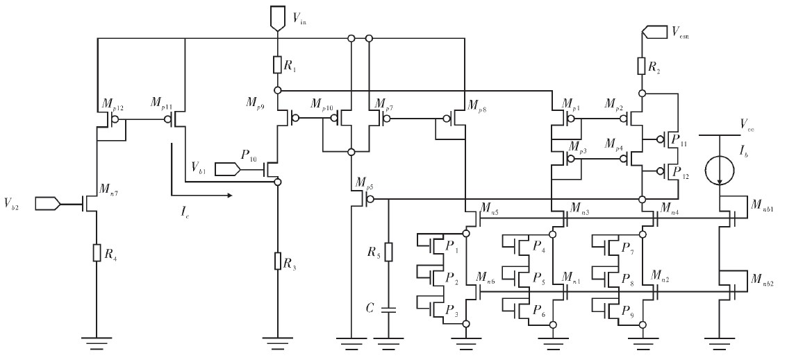 為使低壓管能在高壓輸入中也正常工作,電壓鏡采用了高低壓器件混用的共源共柵結(jié)構(gòu)。Mp1、Mp2、Mn1和Mn2為低壓管;Mp3、Mp4、Mn3和Mn4為高壓管。一方面,高壓管作為共源共柵器件增大了輸出電阻;另一方面,它承受了大部分壓降,以保護(hù)低壓管不被擊穿。不過,共源共柵結(jié)構(gòu)帶來另一個(gè)問題。串聯(lián)電阻R2令Mp2和Mp4之間的次極點(diǎn)更靠近原點(diǎn),使系統(tǒng)變得不穩(wěn)定。為消除該極點(diǎn)帶來的影響,在共源共柵結(jié)構(gòu)的輸出端加入補(bǔ)償電阻R5和電容C,引入一個(gè)零點(diǎn)并使主極點(diǎn)更低。