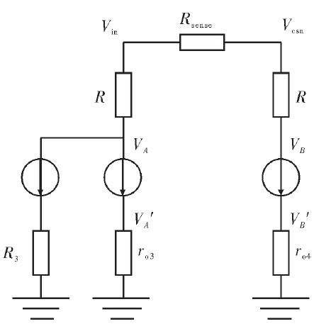 在實(shí)際電路中,VA對(duì)VB的匹配度直接影響采樣精度。圖3為簡(jiǎn)化的小信號(hào)模型。圖4為實(shí)際電路圖。Vin與Vcsn為精確采樣電阻Rcsn兩端電壓,輸入范圍8~40 V;Vcc為芯片內(nèi)部5 V穩(wěn)定電源。